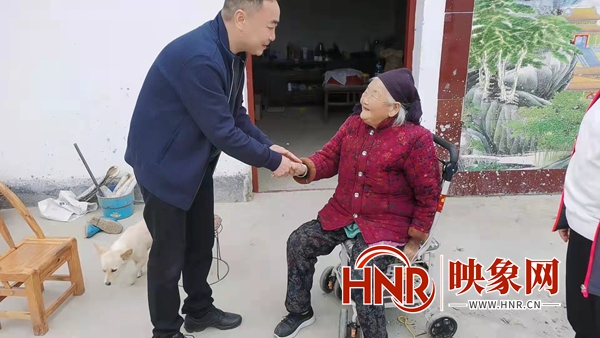 映象网讯(记者 黄向阳 见习记者 马景阁 通讯员 张志远 )金秋十月精神爽,丹桂飘香人寿增,近日,驻马店市老河乡党委书记张湘军、乡长乔阳带着对全乡老年人的关心和牵挂,走访慰问百岁老人张玉勤,为老人送去党和政府的关怀与祝福。